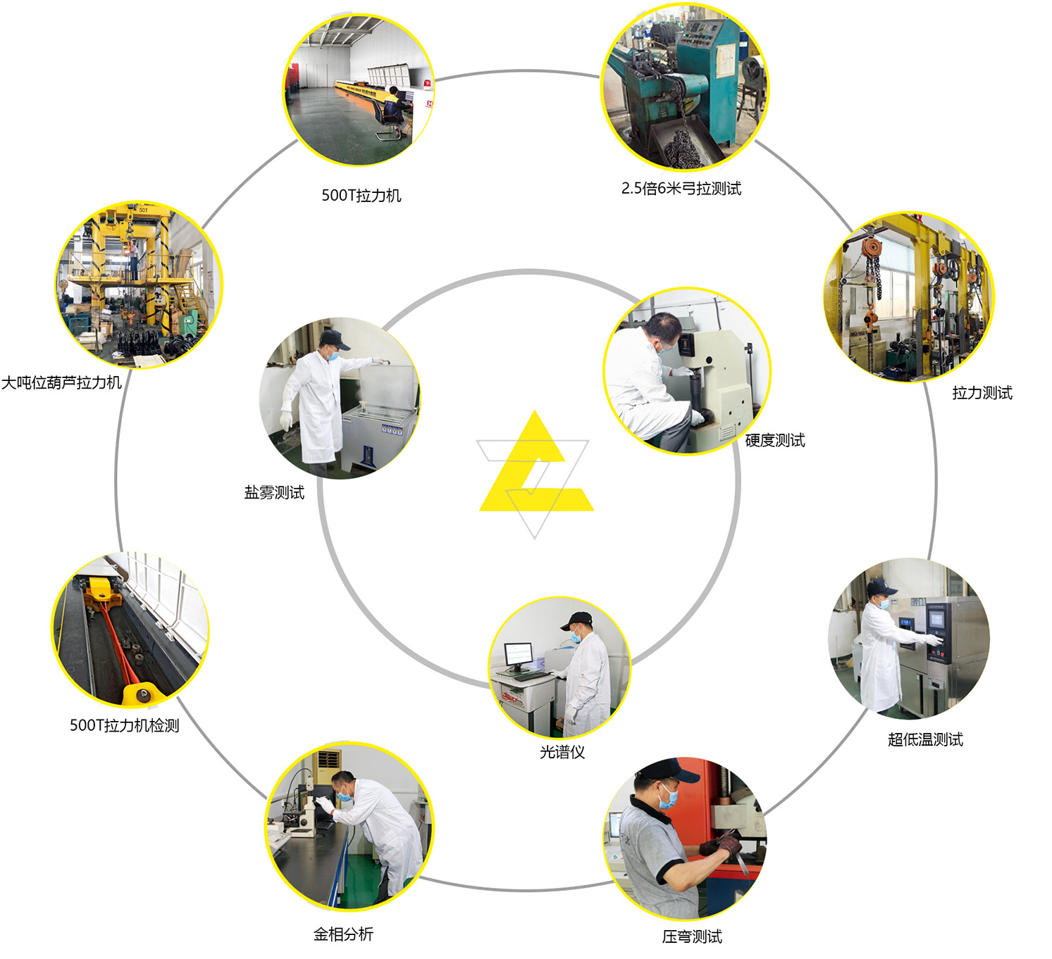 2011年起,投入資金2000萬元建立了集團公司質量檢測中心,其中,智 能化吊帶抗磨測試儀、智 能化材料分析儀、大噸位拉力機、萬 能拉力機、拉力試驗設備,化學成分分析設備,硬度測試設備,鹽霧設備,超低溫測試設備等檢測設備,具有全 國先進的技術水平,公司的先進檢測設備,在原材料檢驗、材質分析、產品過程控制、拉力試驗和成品出口抽檢等環(huán)節(jié)實現了有效的全過程科學控制,確保實現了產品的批合格率。